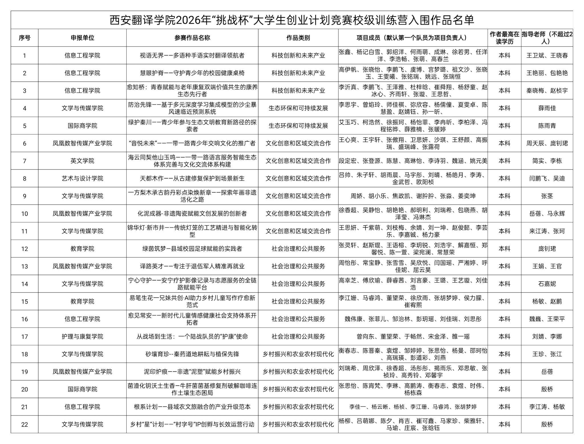 为深入贯彻习近平新时代中国特色社会主义思想,进一步引导我校广大青年学生努力培养科学精神和科学态度,积极学习科学知识和科学方法,踊跃投身创新驱动发展战略,推动大学生课外学术科技活动蓬勃发展,实现大学生创新成果有效转化,我校于12月19日举办了西安翻译学院2026年“挑战杯”大学生创业计划竞赛决赛。根据评审结果,现将入围校级训练营作品名单予以公示。