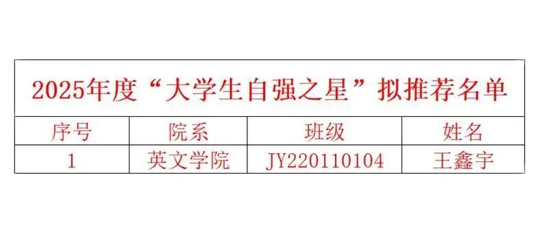 根据《关于开展2025“中国大学生自强之星”公益活动的通知》文件要求,经学生申报、学院推荐、现场答辩、校团委审核等环节,我校拟推荐王鑫宇同学为2025“中国大学生自强之星”候选人。现将候选人名单公示如下: