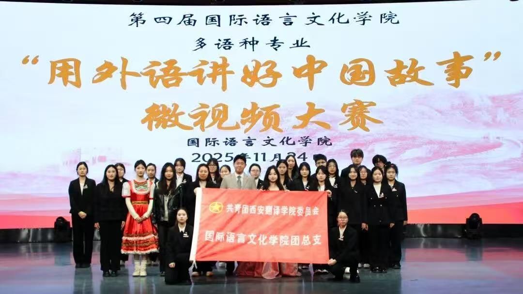 11月24日,第四届国际语言文化学院多语种专业“用外语讲好中国故事”微视频大赛决赛于东区一号综合楼五楼演播大厅举办。西安翻译学院党委副书记兼副校长张恒,副校长武忠远、郭炜,国际语言文化学院院长李庆明等嘉宾出席本次活动;校党委组织部部长李雪莹等担任评委;各晋级队伍及师生代表参加活动。本次比赛以“我眼中的西译”为主题,9支队伍依次展播作品,涵盖西班牙语、俄语、德语等多语种。《书签中的方舟》以朝鲜语串联校园十年时光,《相遇西译,情连中俄》定格中俄学子友谊,《用emoji打开西译》用西班牙语与青春符号展现校园活力,作品均以镜头记录校园风貌与成长故事,兼具语言专业性与文化感染力。赛前全体奏唱国歌,赛后评委郑璐肯定作品“主题深、语言实、形式新”,并指出需强化情感张力与叙事逻辑;郭炜副校长寄语学子,当深耕语言之道,锤炼跨文化传播本领。《书签中的方舟》获一等奖,《迷彩与课本》《相遇西译,情连中俄》获二等奖,3部作品获三等奖,3部作品获优秀奖。现场举行颁奖仪式,全体嘉宾、评委、参赛及幕后人员合影留念。此次大赛既是多语种学科实践的生动体现,更让西译故事成为世界了解中国的青春窗口。