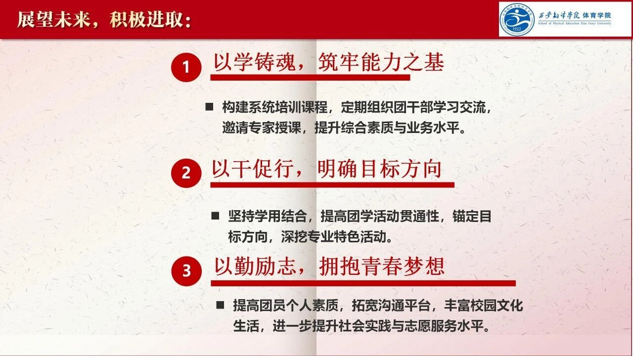 新岁序开,奋楫争先。展望2026年,体育学院共青团将坚守立德树人根本任务,立足体育专业特色持续深耕。以思想引领与体育实践深度融合为核心,创新育人模式;聚焦团学骨干专业能力与综合素养双向提升,完善培养机制;提升“一站式”学生社区育人效能,优化服务供给;打造具有体育辨识度的品牌活动,增强组织凝聚力。同时深化基层组织建设,激活支部内生动力,锻造坚强有力的团组织,引领广大青年在体育竞技中锤炼本领,在服务社会中挺膺担当,在强国建设征程中践行青春使命。
