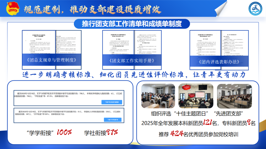 岁末回眸,征程如卷。2025年,我校共青团工作始终紧扣时代脉搏,在党的坚强领导下,扎实推进全面从严治团,持续提升基层团组织引领力、组织力、服务力和大局贡献度。各学院团总支深耕主责主业,聚力铸魂育人,积极回应青年关切,着力引领广大团员青年坚定理想信念、锤炼过硬本领、投身强国实践,共同奏响了服务学校发展、助力青年成长的奋进乐章。