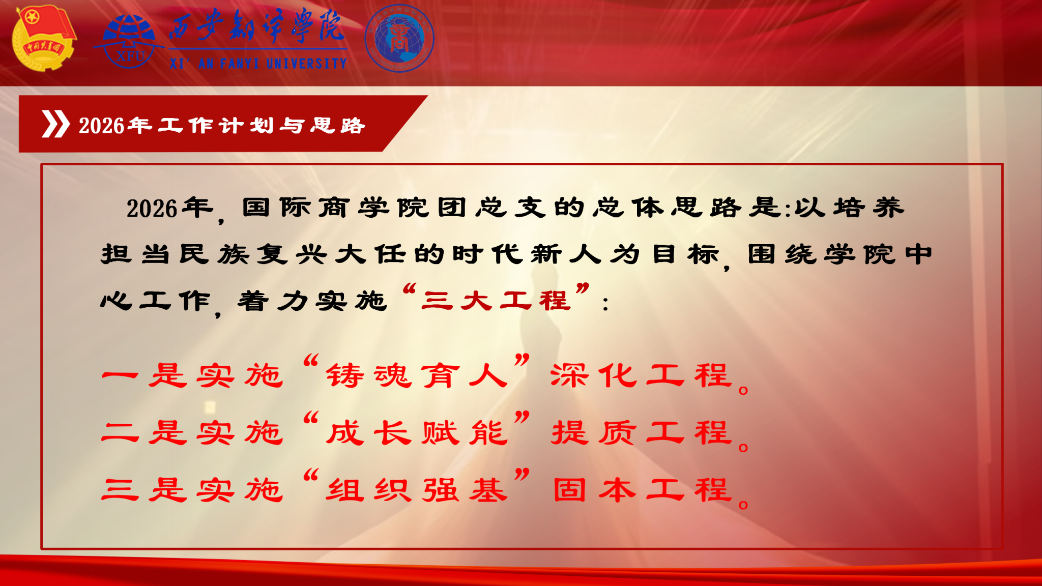 新程伊始,敢为人先。展望2026年,国际商学院团总支将锚定培养时代新人目标,立足商科特色与国际视野,围绕学院中心工作实施“三大工程”,打造具有商科辨认度的特色团学工作体系。深化“铸魂育人”工程,创新理论学习与主题教育形式,建立“理论导师”制度;推进“成长赋能”提质工程,完善学业帮扶机制,拓展国际化素养提升项目,培育创新创业项目。同时,直面思想引领、专业融合、基层建设、新媒体运营等现存问题,以更精准的举措、更务实的作风,团结带领商科青年在强国建设的火热实践中挺膺担当、践行青春使命。