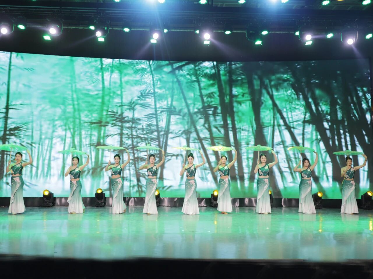 开场舞《竹林掠影》轻盈身影舞态翩跹开启晚会灵动雅致的序章舞者们身姿恰似清风拂竹点燃现场氛围为盛