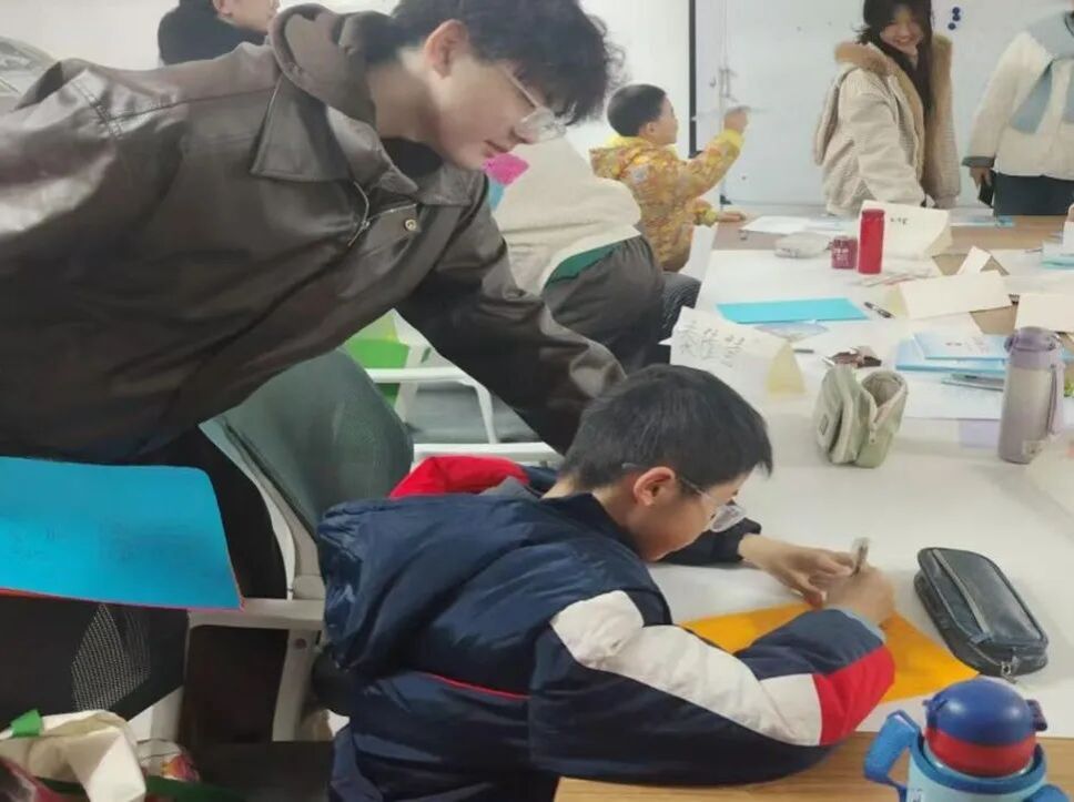 课堂上孩子们天马行空的提问,课间的小争执,墨水蹭到衣服上的小意外,都是日常。我从最初的焦躁无措,慢慢变得耐心温和,看着孩子们的天真烂漫,仿佛看到了小时候的自己,也更能理解他们的行为与想法。让我印象最深的是一次书法课,授课老师迟迟未到,孩子们开始吵闹,我们临时决定组织五子棋比赛,每组安排大学生引导。等老师赶到时,孩子们都在专注对弈,课堂秩序井然。还有叫舟舟的小男孩,举着自己写的大福字自豪地展示,孩子们争相比拼的模样,让课堂充满欢声笑语。
