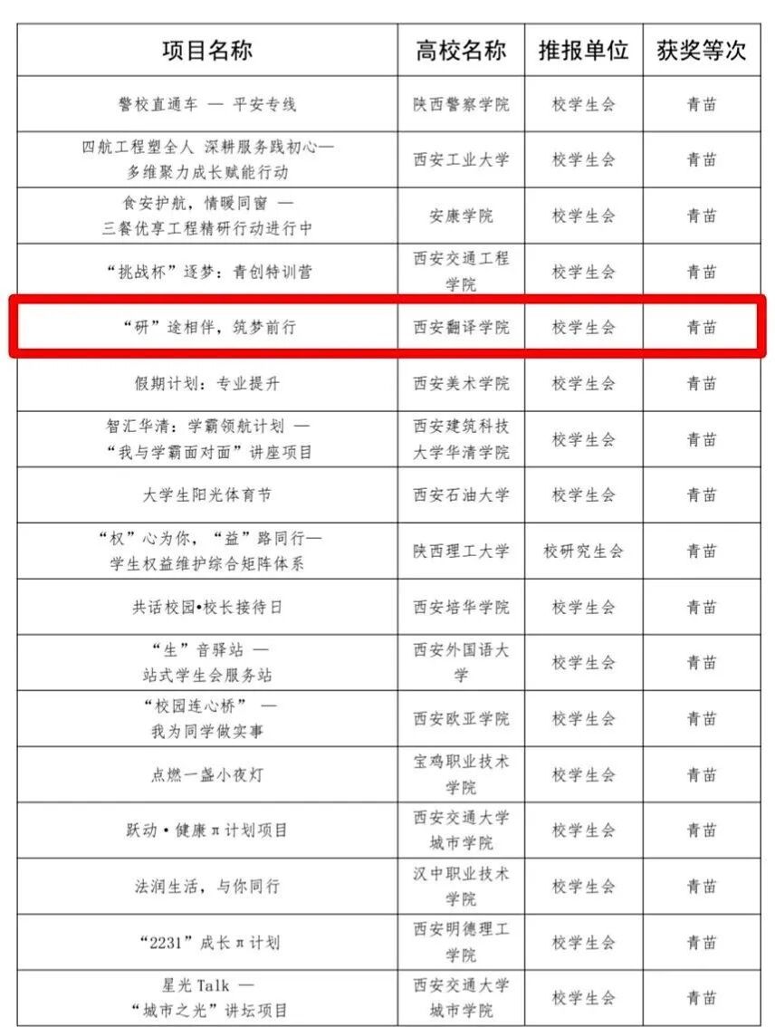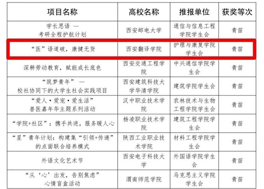近日,由团省委、省学联开展的陕西省高校学生会组织“我为同学做实事”项目评选活动结果重磅揭晓。我校校学生会“‘研’途相伴,筑梦前行”项目与护理与康复学院学生会“‘医’语道破,康健无惑”项目,在全省高校的激烈角逐中成功入围,最终双双斩获省级“青苗奖”。